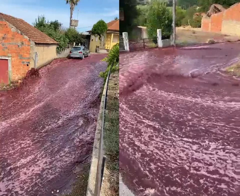 Em vez de água de chuva, litros de vinho tinto tomaram conta de ruas de Anadia, a 30 quilômetros de Coimbra, por conta de um vazamento em uma destilaria local.