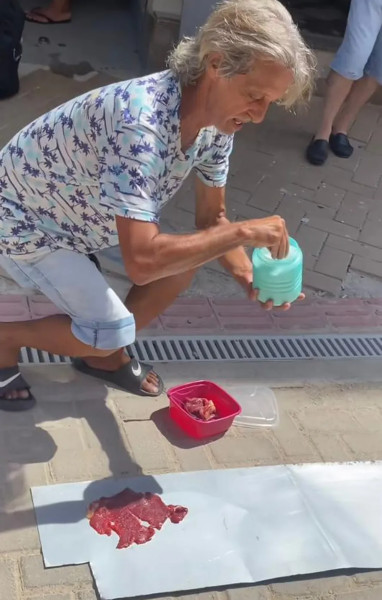 Já no vídeo em que aparece fritando a carne, Jorge estende uma tábua no asfalto e coloca os pedaços para cozinhar. “Bife prometido, no asfalto”, ele escreve. “Está frito já”, diz ao oferecer a carne a quem passa por lá.