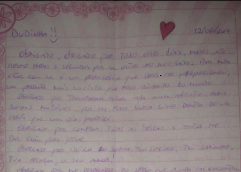 Ullisses divulgou uma calcinha preta e uma carta escrita à mão, de 12 de junho de 2016, data em que se comemora o Dia dos Namorados. O texto cita “Dudinha” e agradece a parceria dentro do presídio de Tremembé, onde os dois teriam se conhecido.